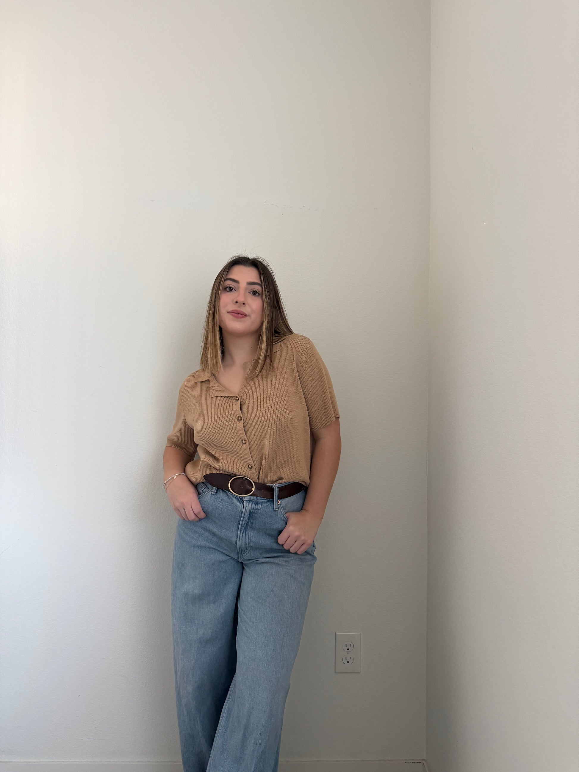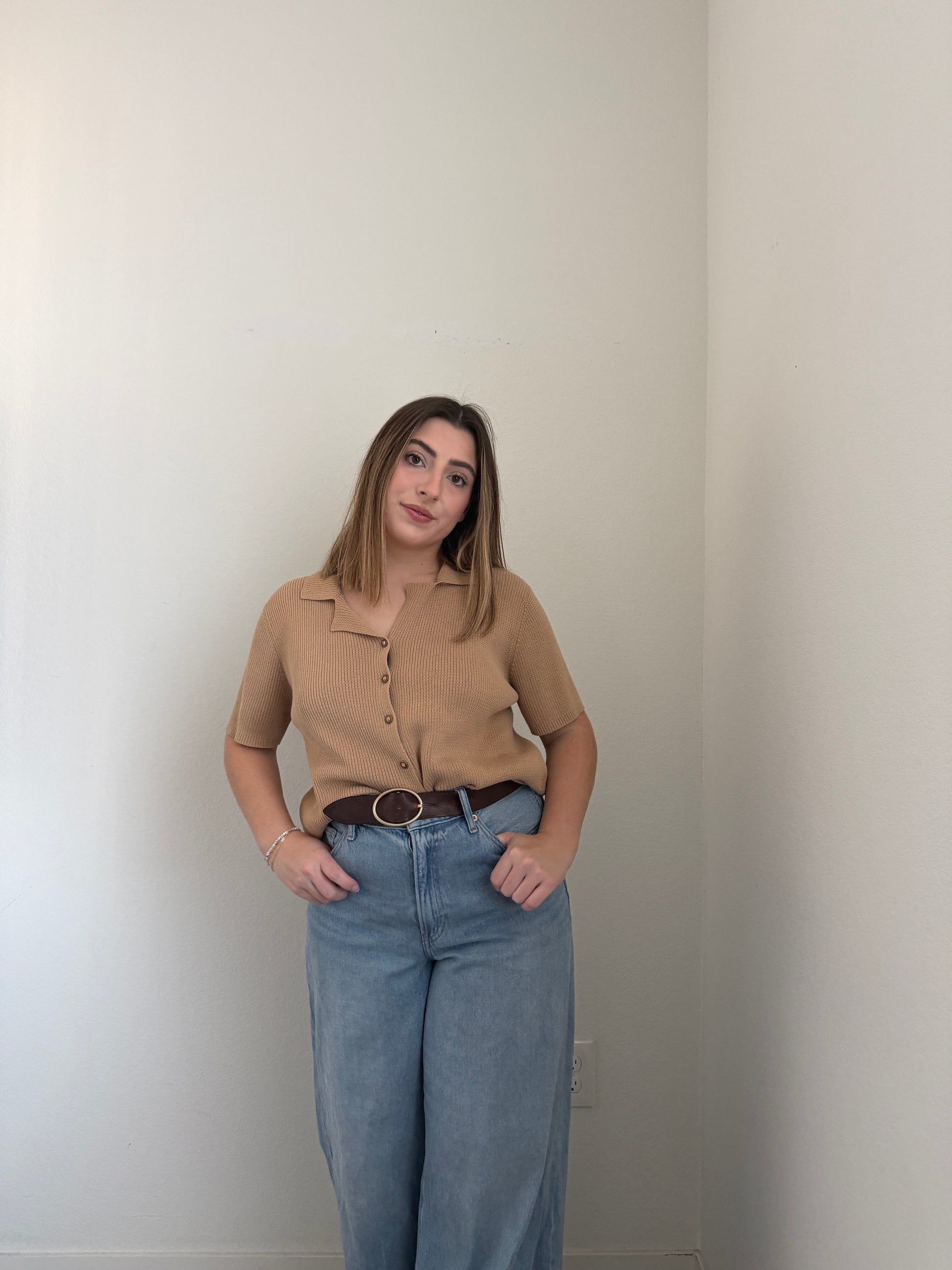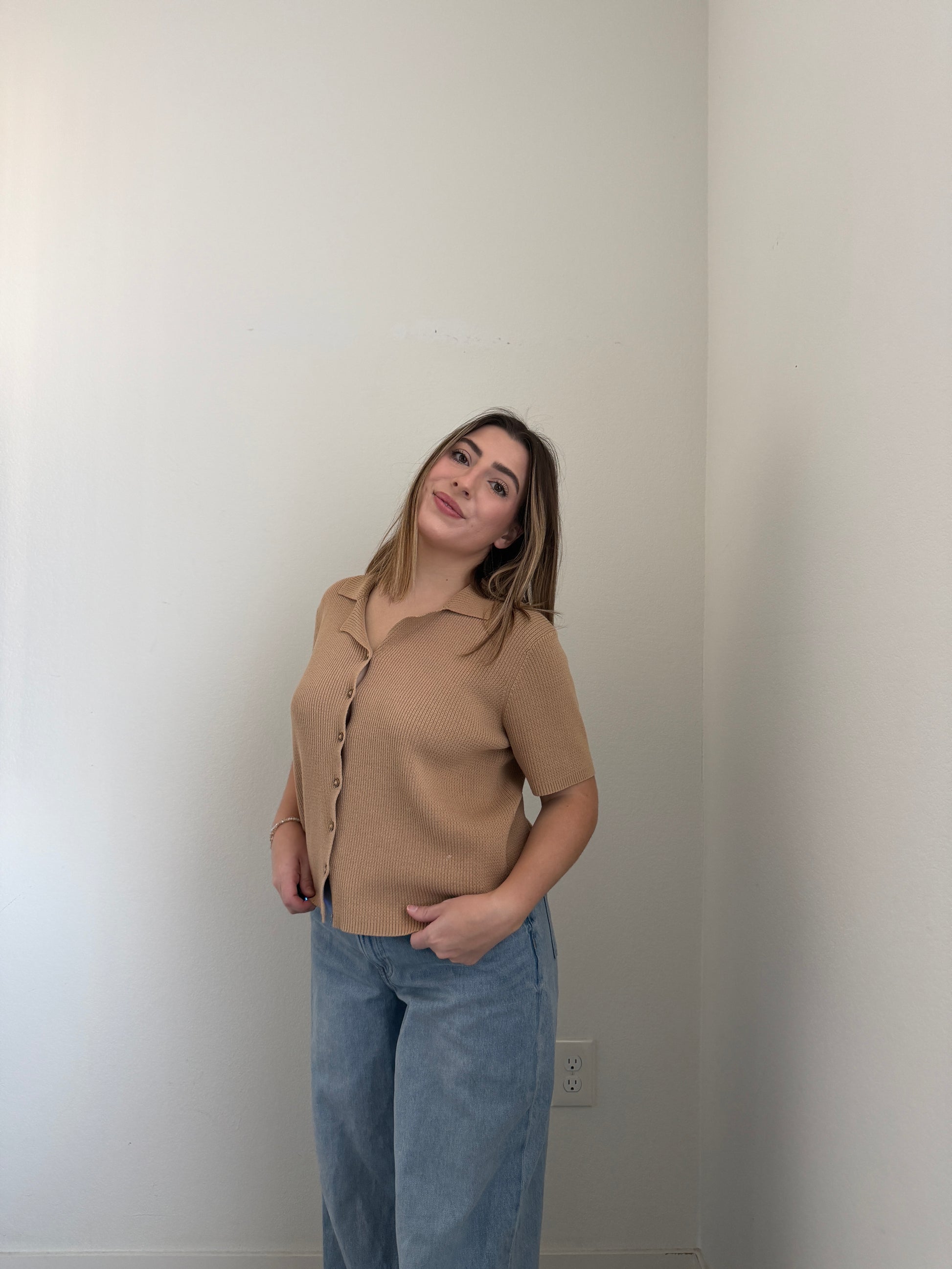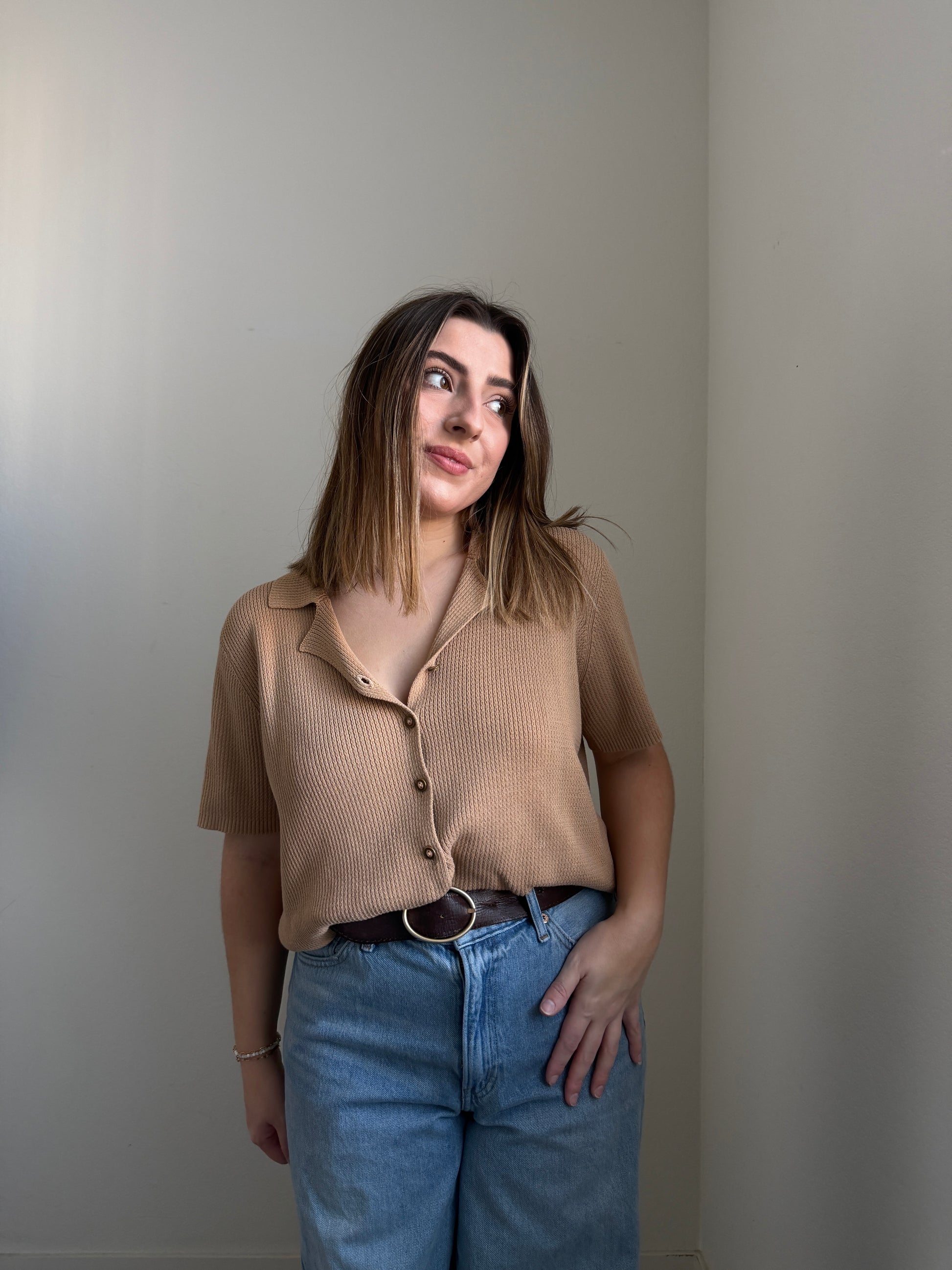 Naming this one after the beloved Camelback mountain, it is the perfect warm brown that looks like the sand on Camelback! Textured similar to a waffle weave, but not quite the same! Buttons up and collared. *tiny little white mark of paint on front