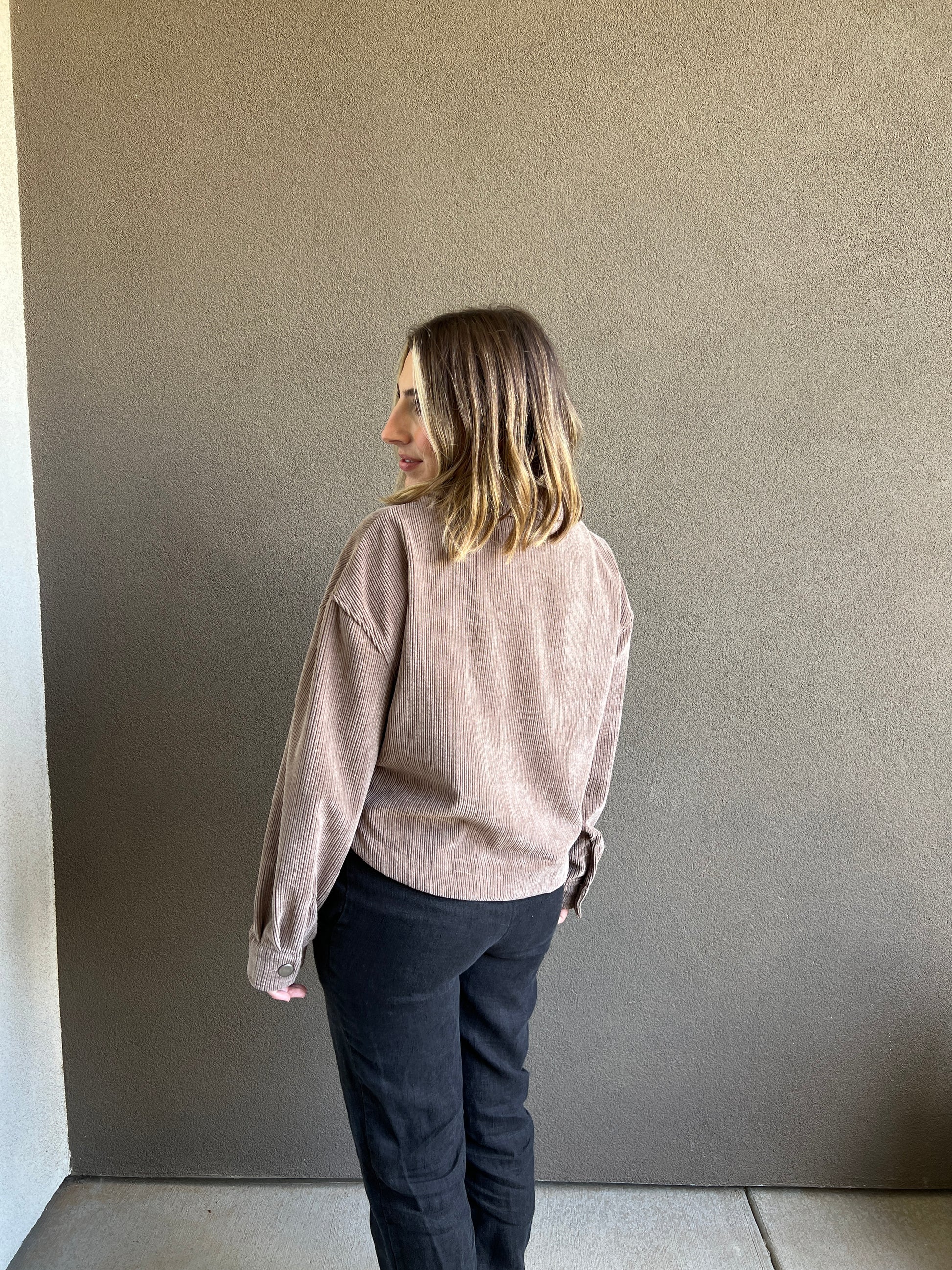 This is the perfect throwover shacket. It is lightweight and the exterior is so soft. Kind of a dusty brown color, buttons on the front, but cute open and closed!