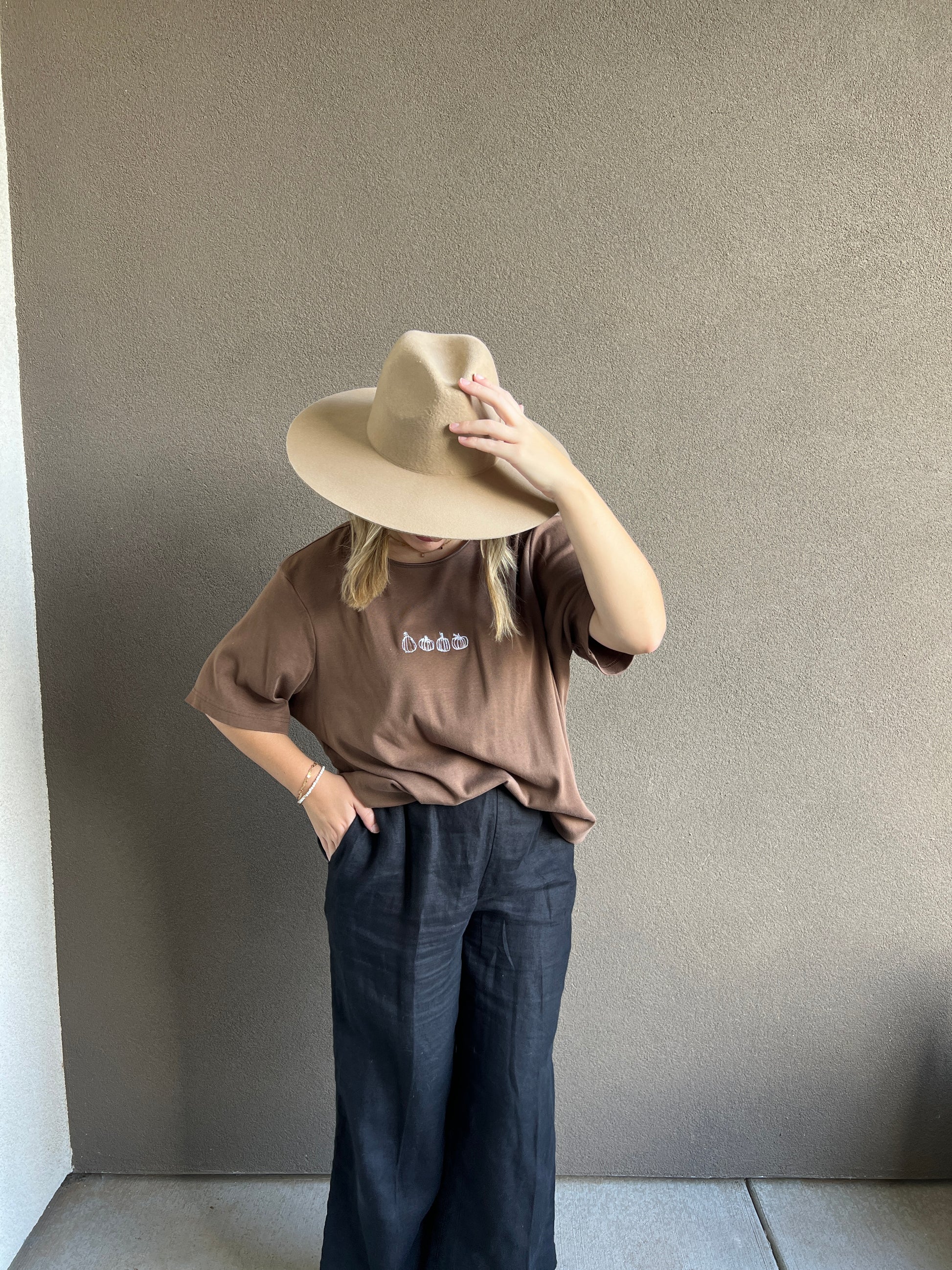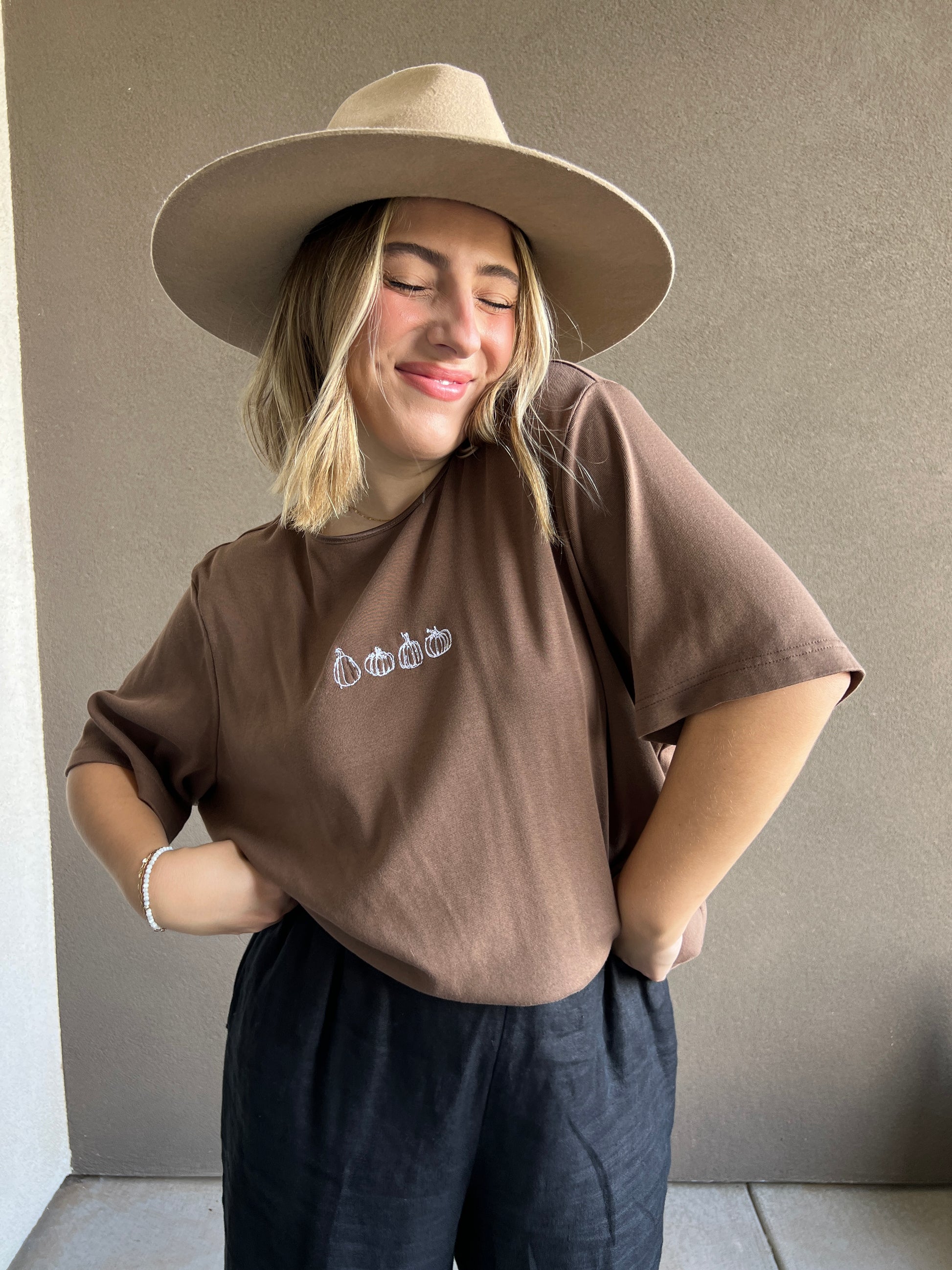 This pumpkin original is done on a super stretchy and comfy tee from Cj banks. Under some overalls or layered with a long sleeve?? Love. This is a thrifted piece that I embroider in house! I loved this design last year and knew we needed to bring it back.