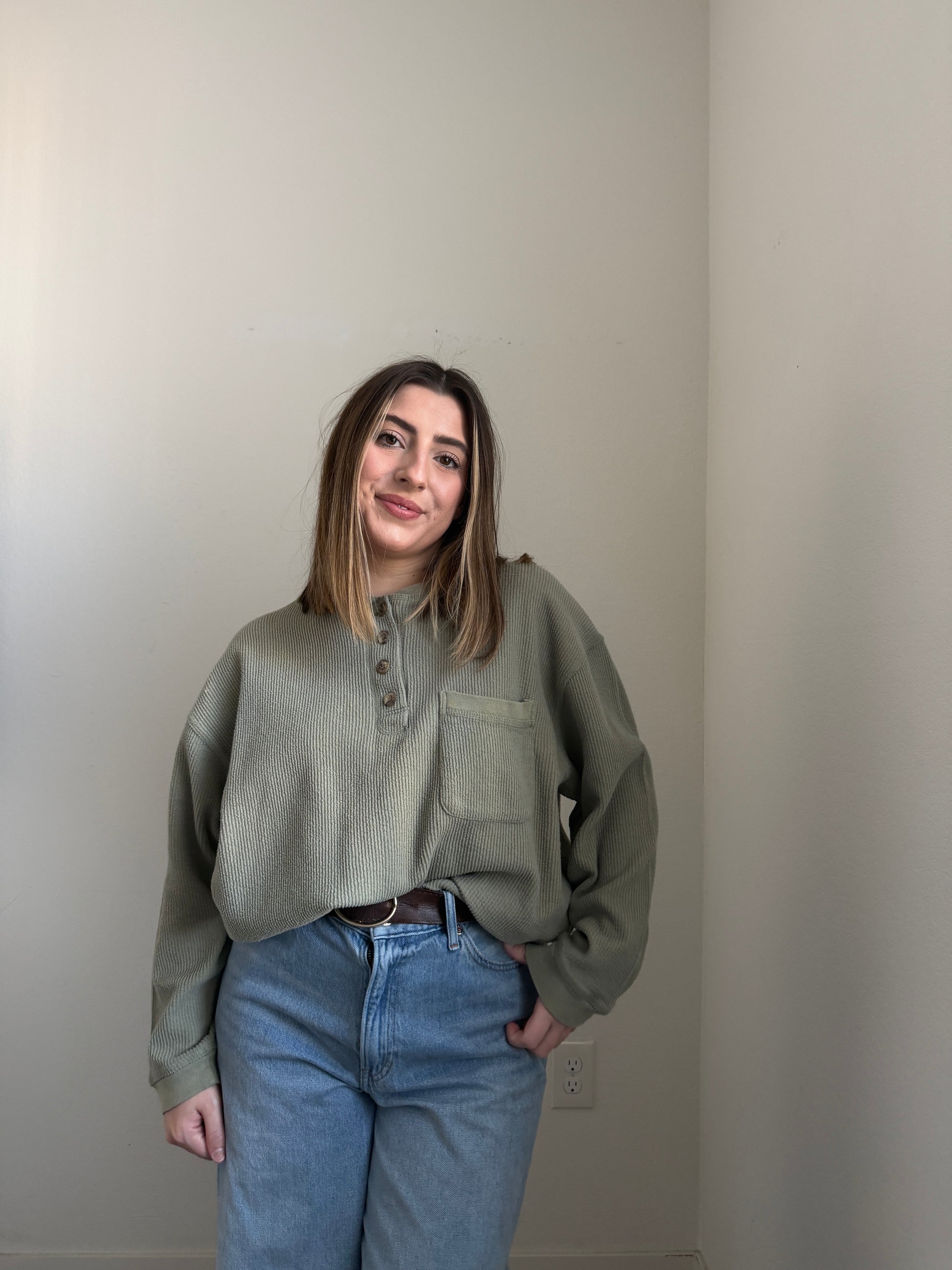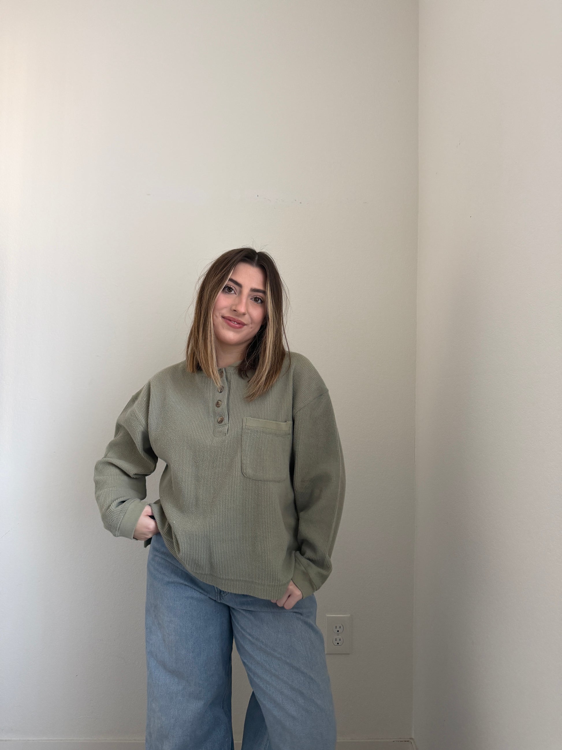 How freaking cozy is this gem?? Ribbed, gabby green with a pocket. I love the fit of this one.