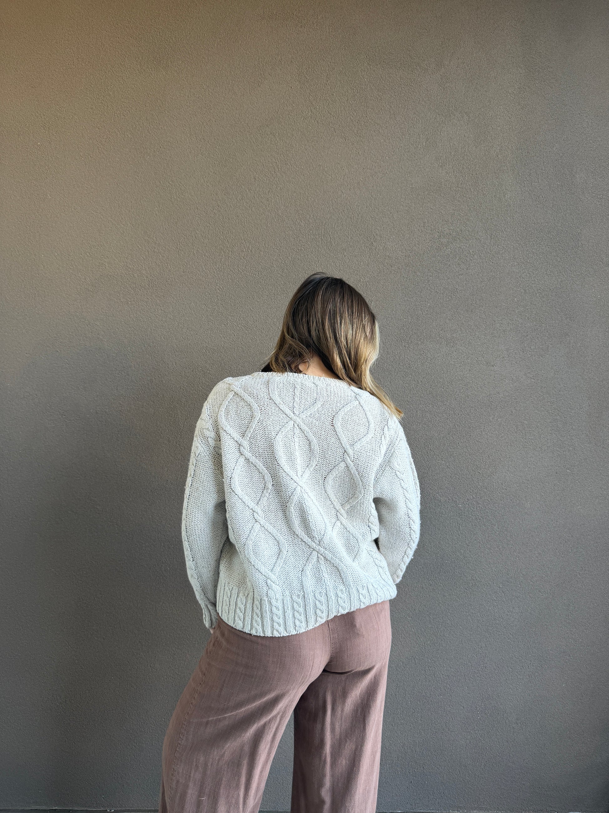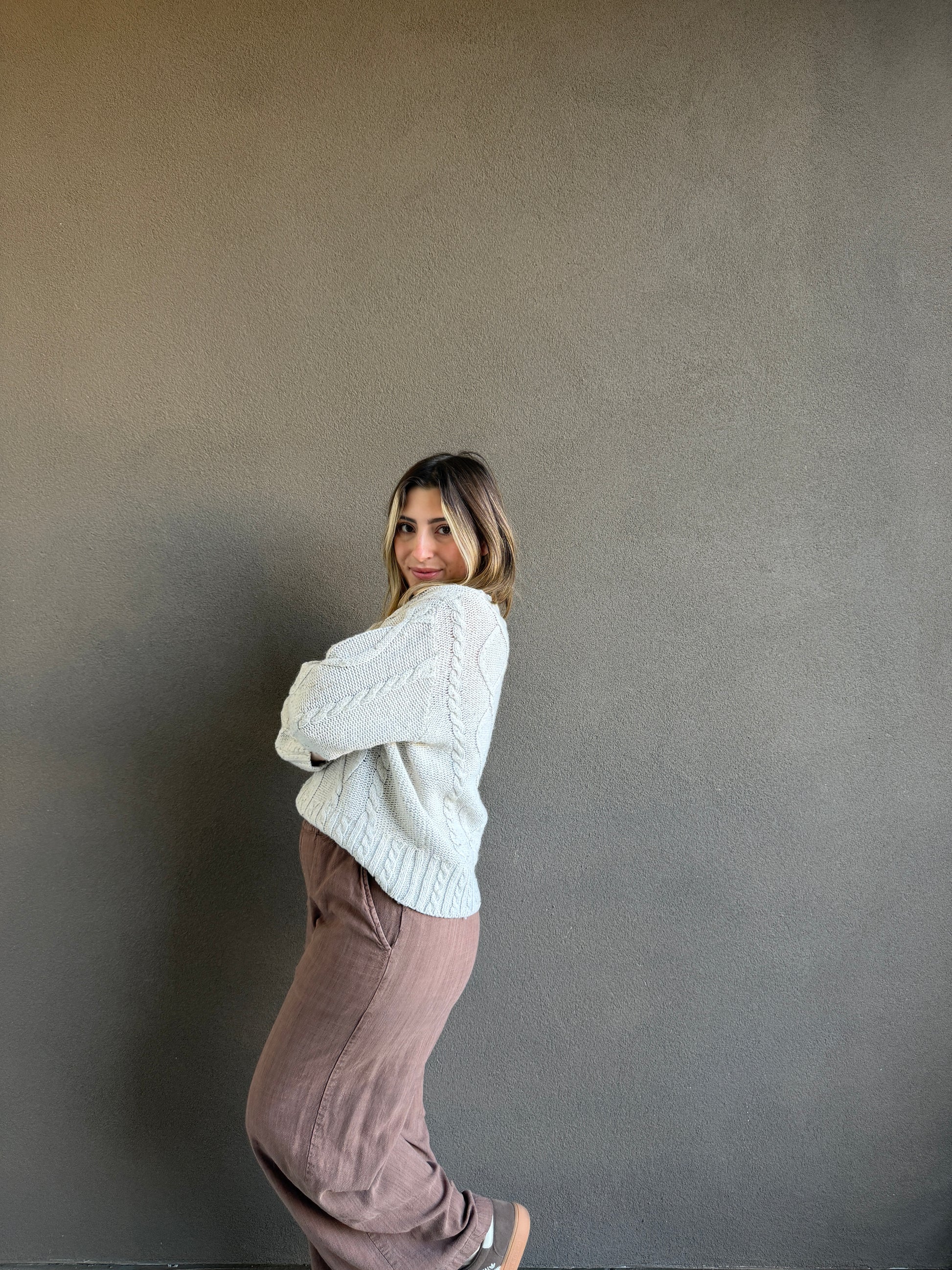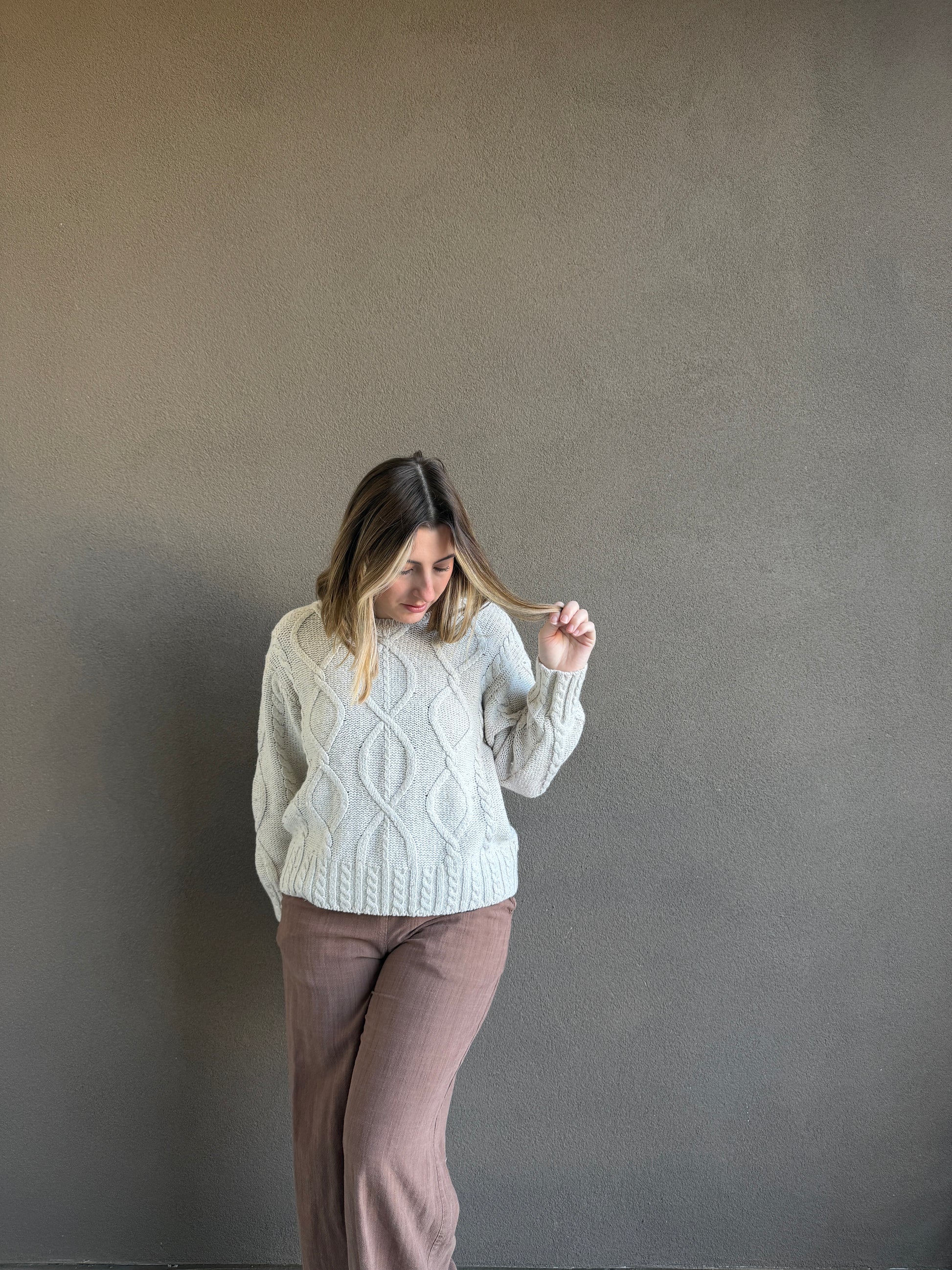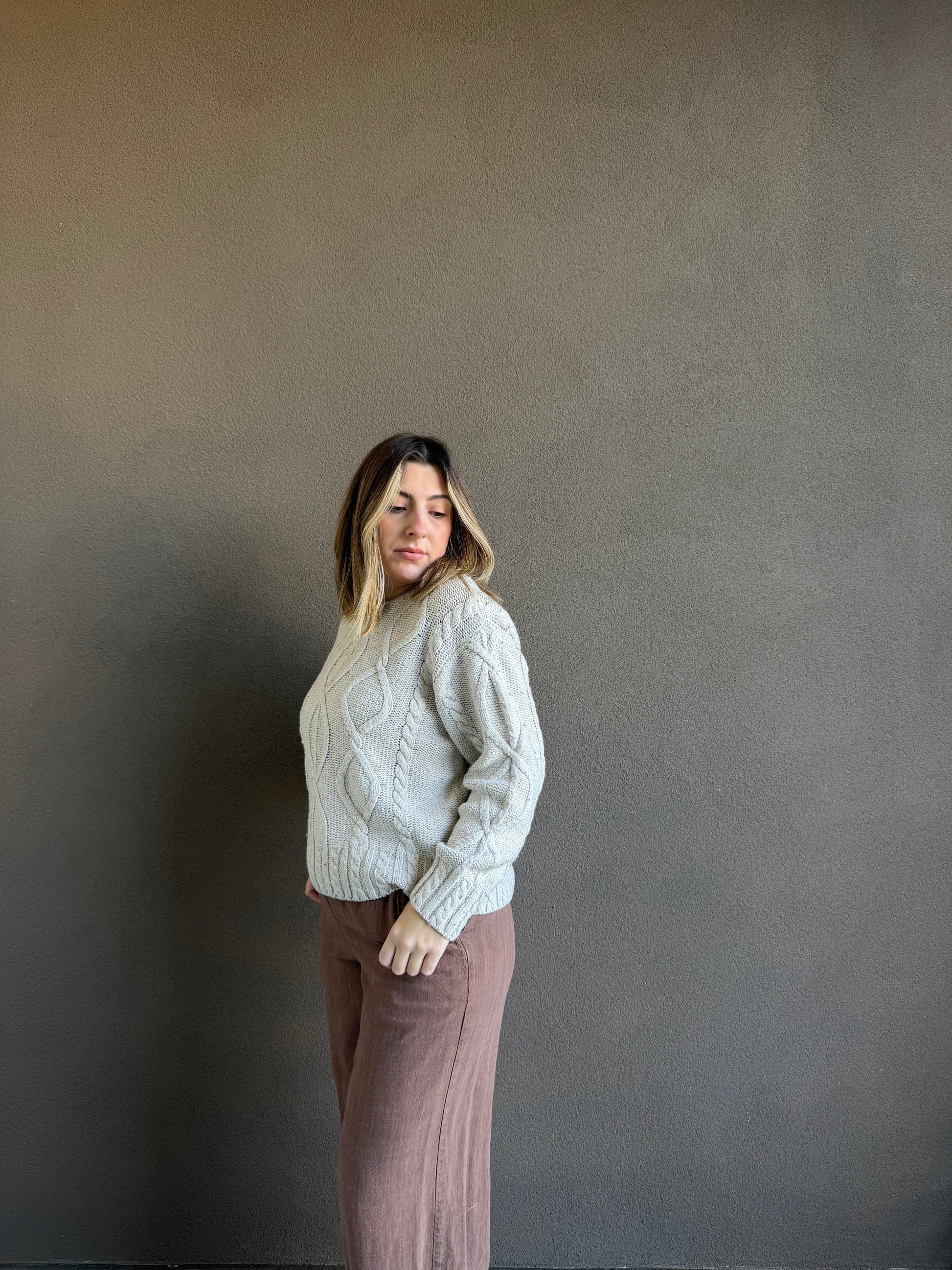 This sweater has a great texture and knit and pattern to it, it is also the perfect neutral tone. It is great for layering.