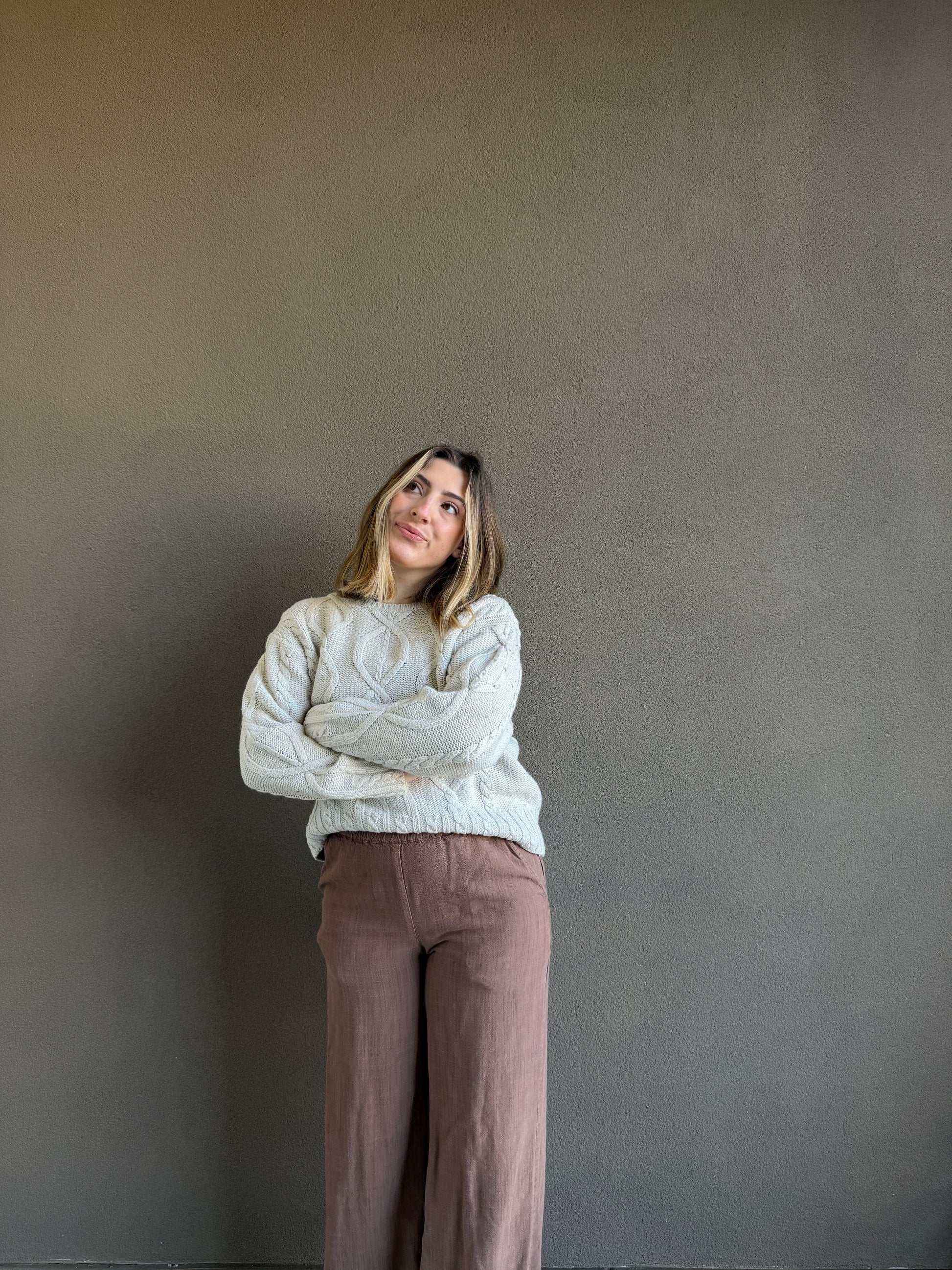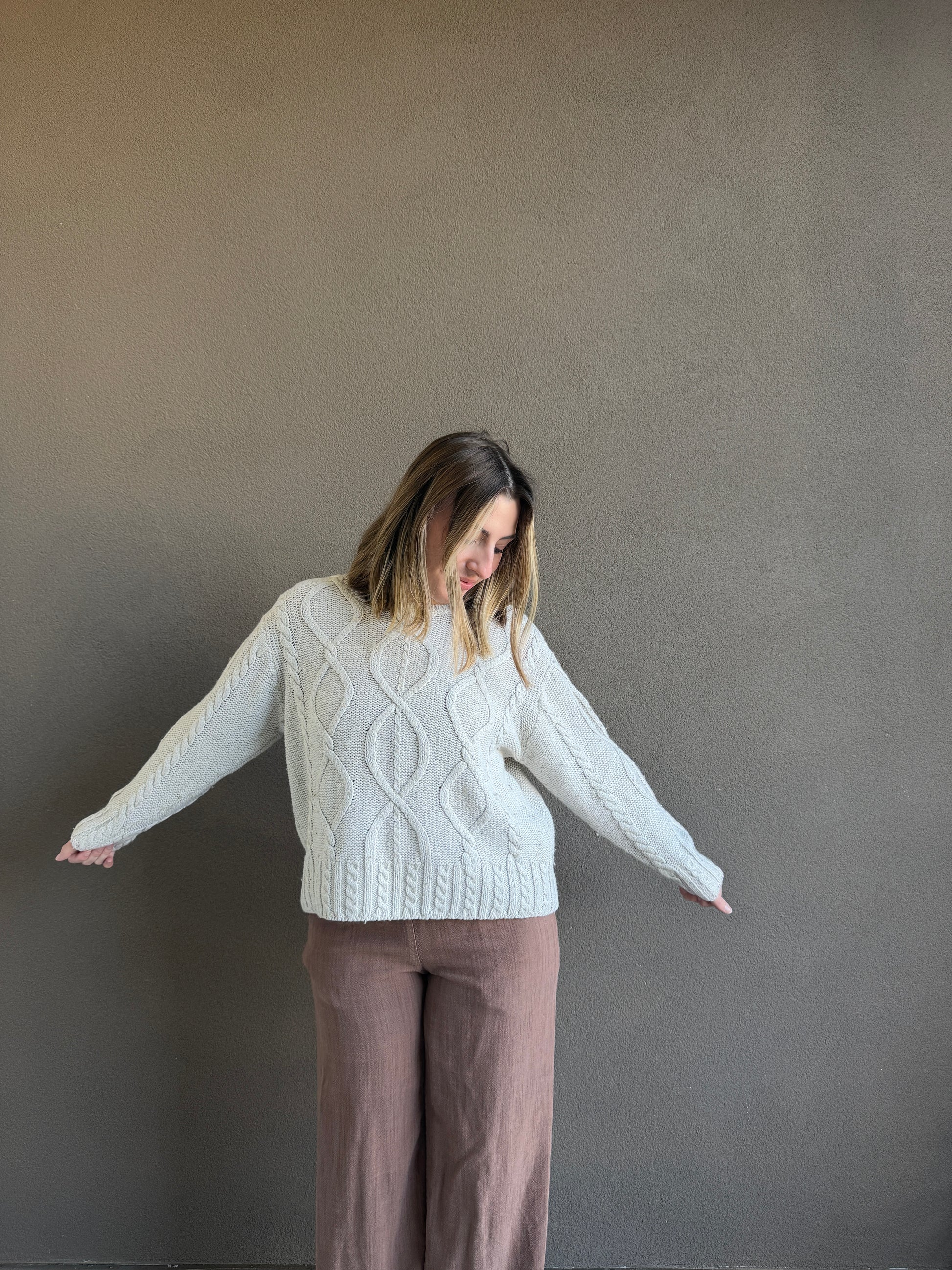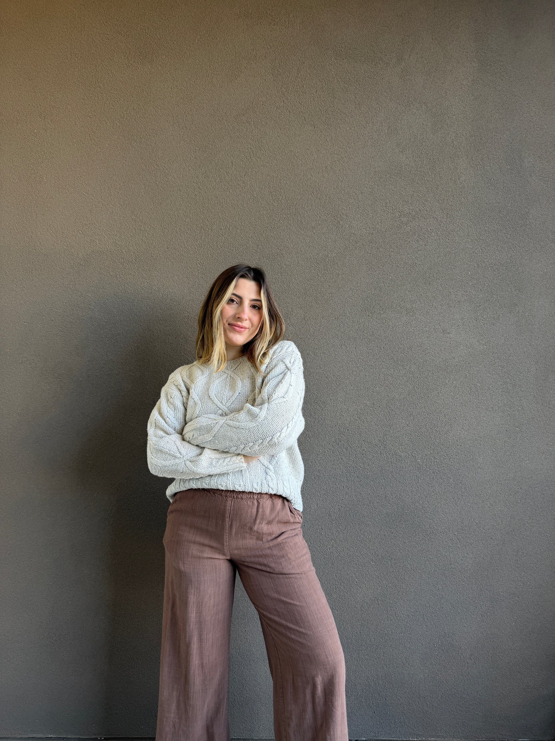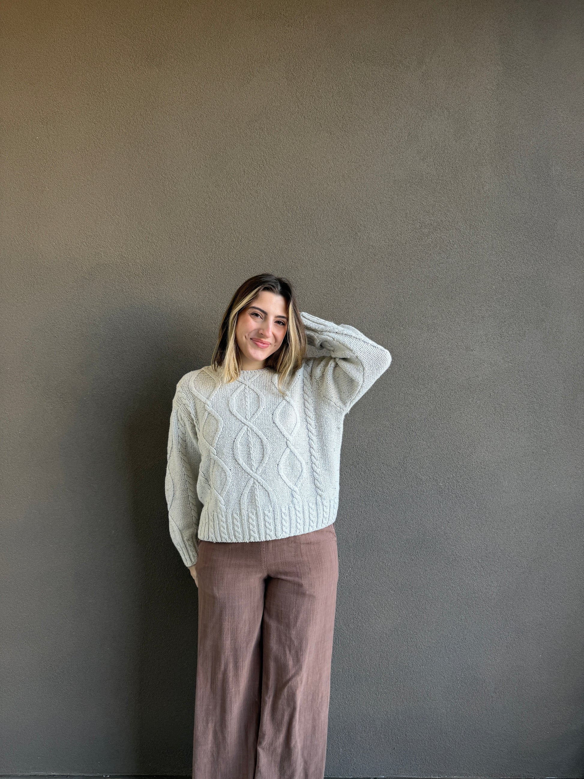 This sweater has a great texture and knit and pattern to it, it is also the perfect neutral tone. It is great for layering.