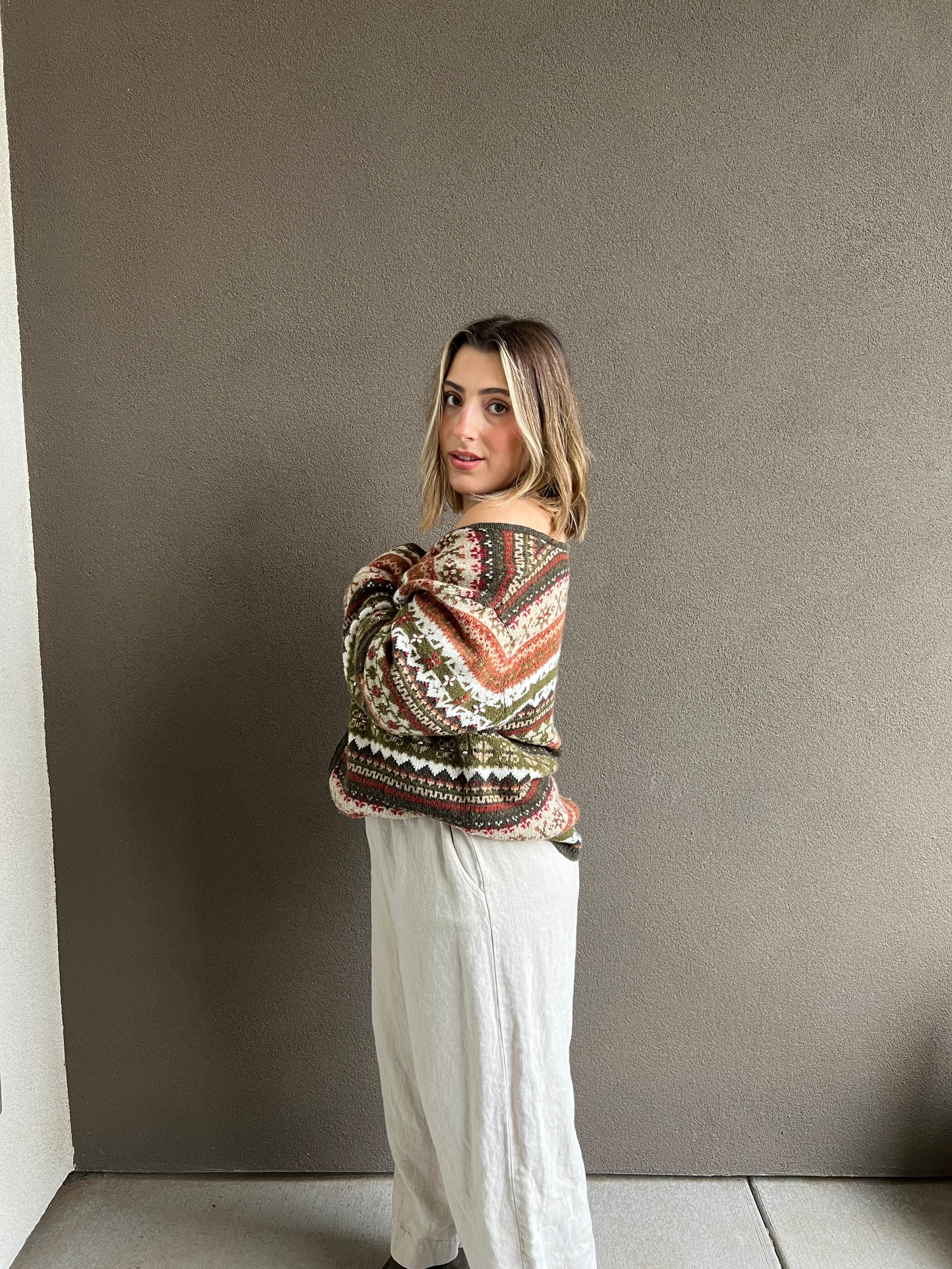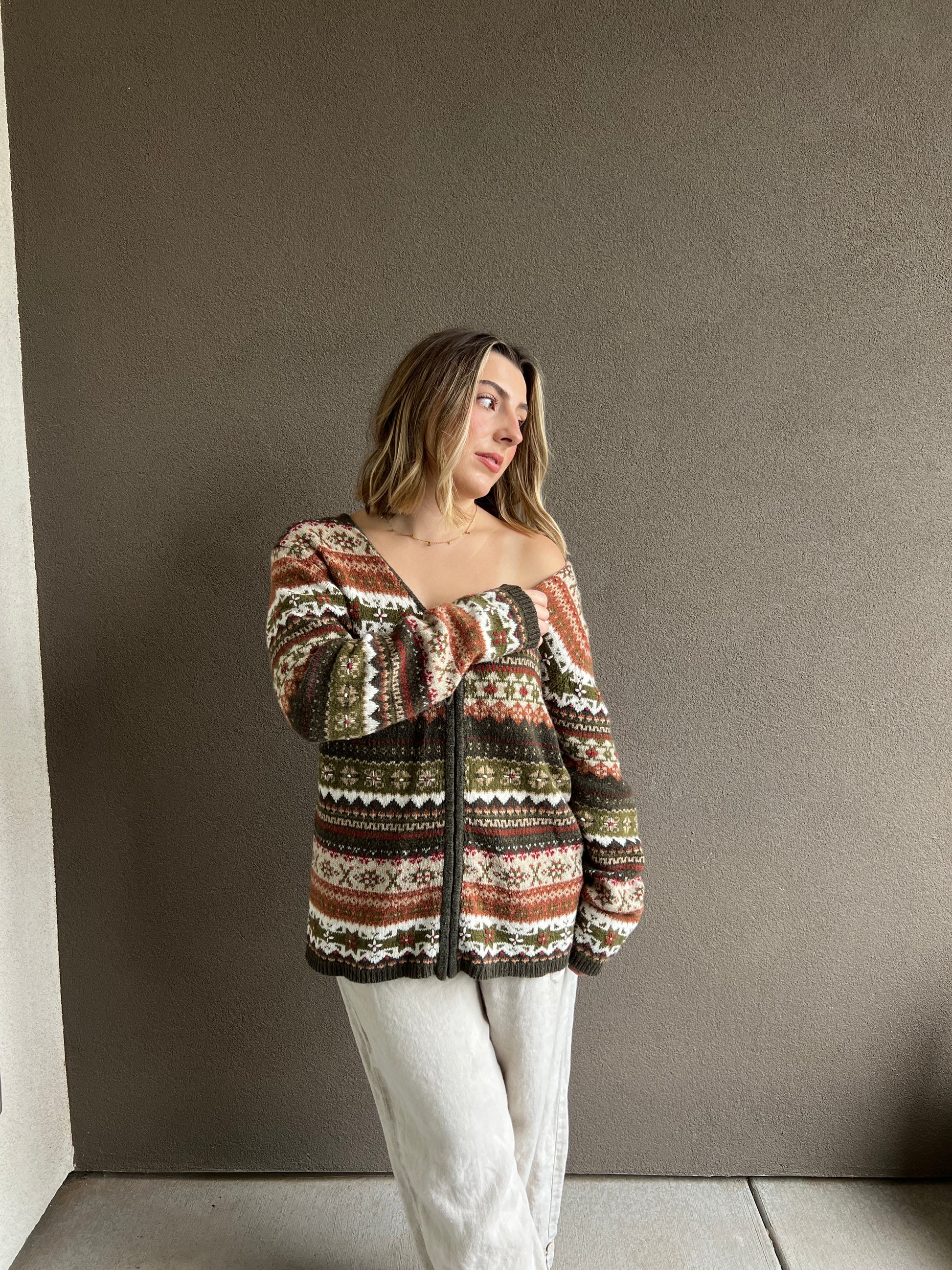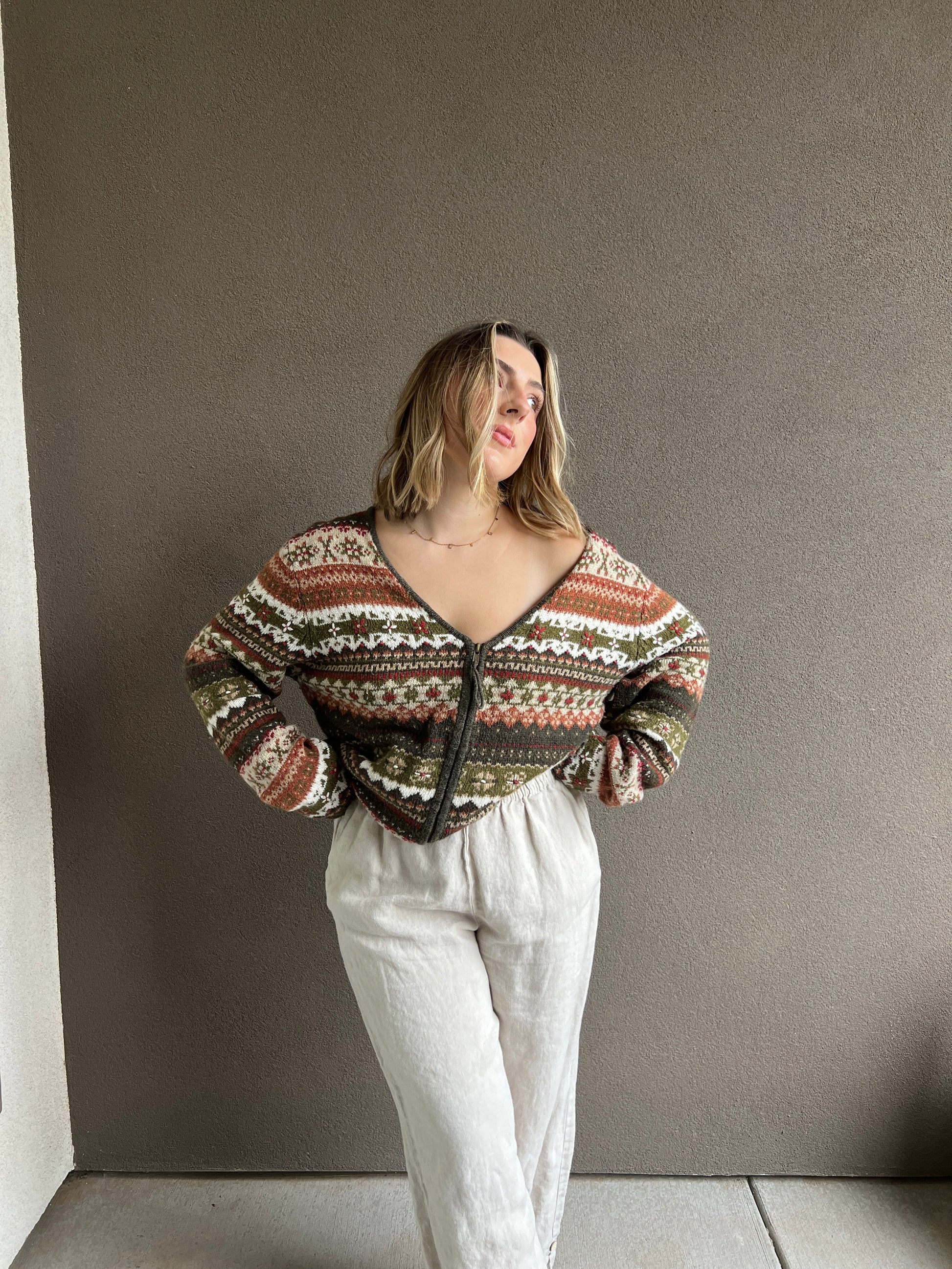 This lil number is giving me changing seasons vibes. It has the beautiful lush green colors along with the reds and rusts of changing fall foliage. Zips up and is so comfy.