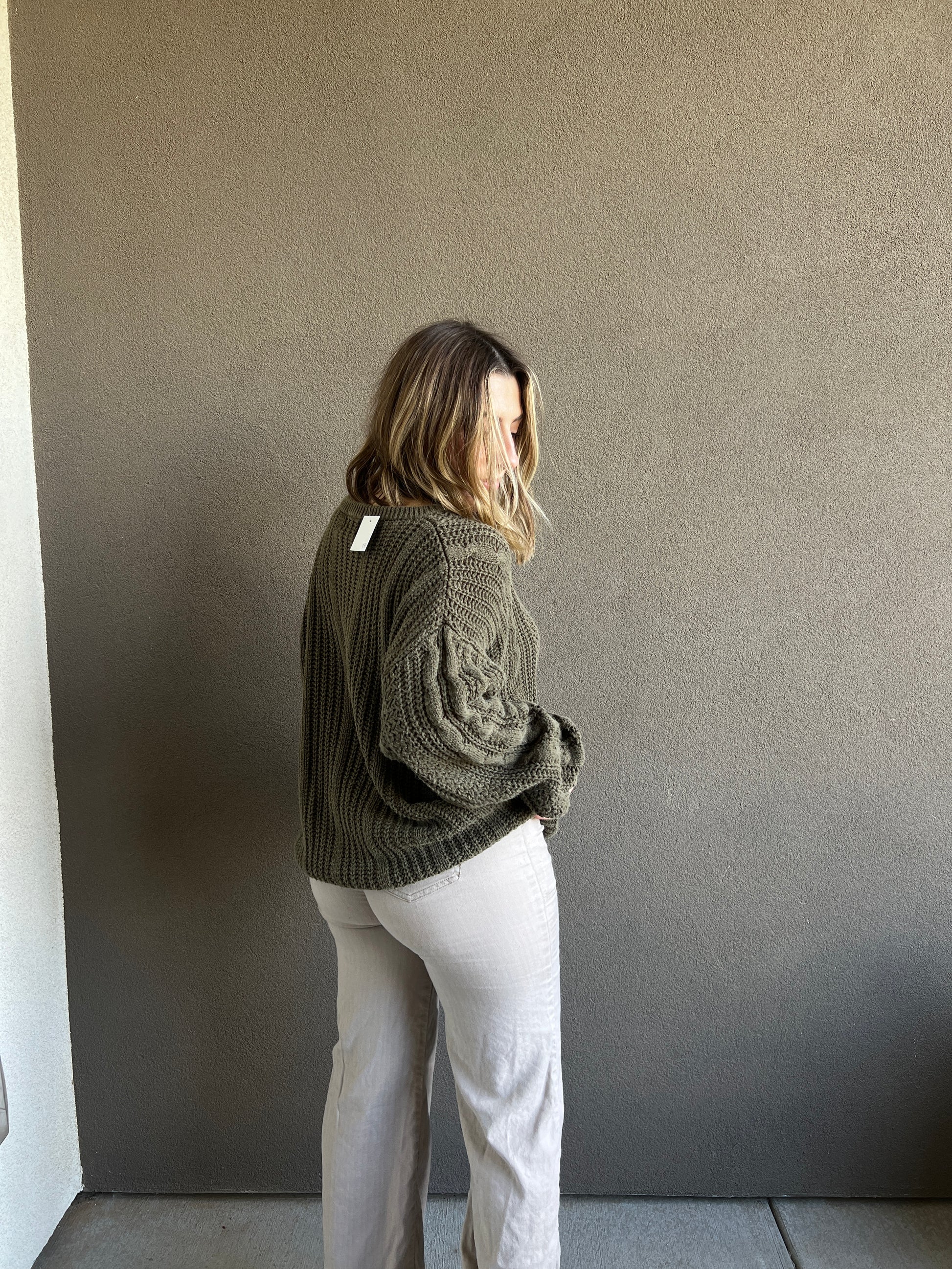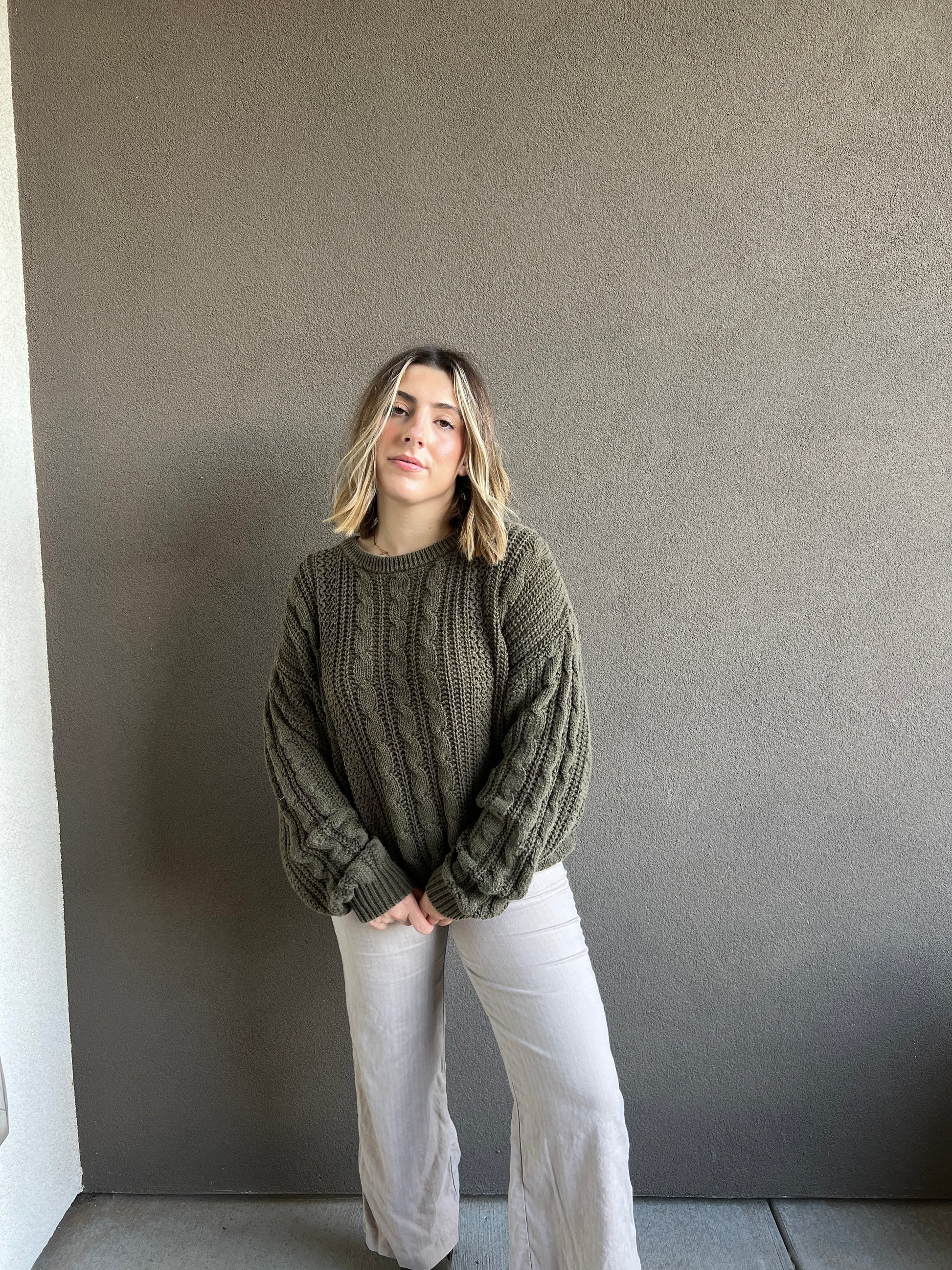 This vintage chunky sweater is gorgeousss. Kind of a greenish brown color, there is definitely some wear on her (pilling) but she is still incredible.
