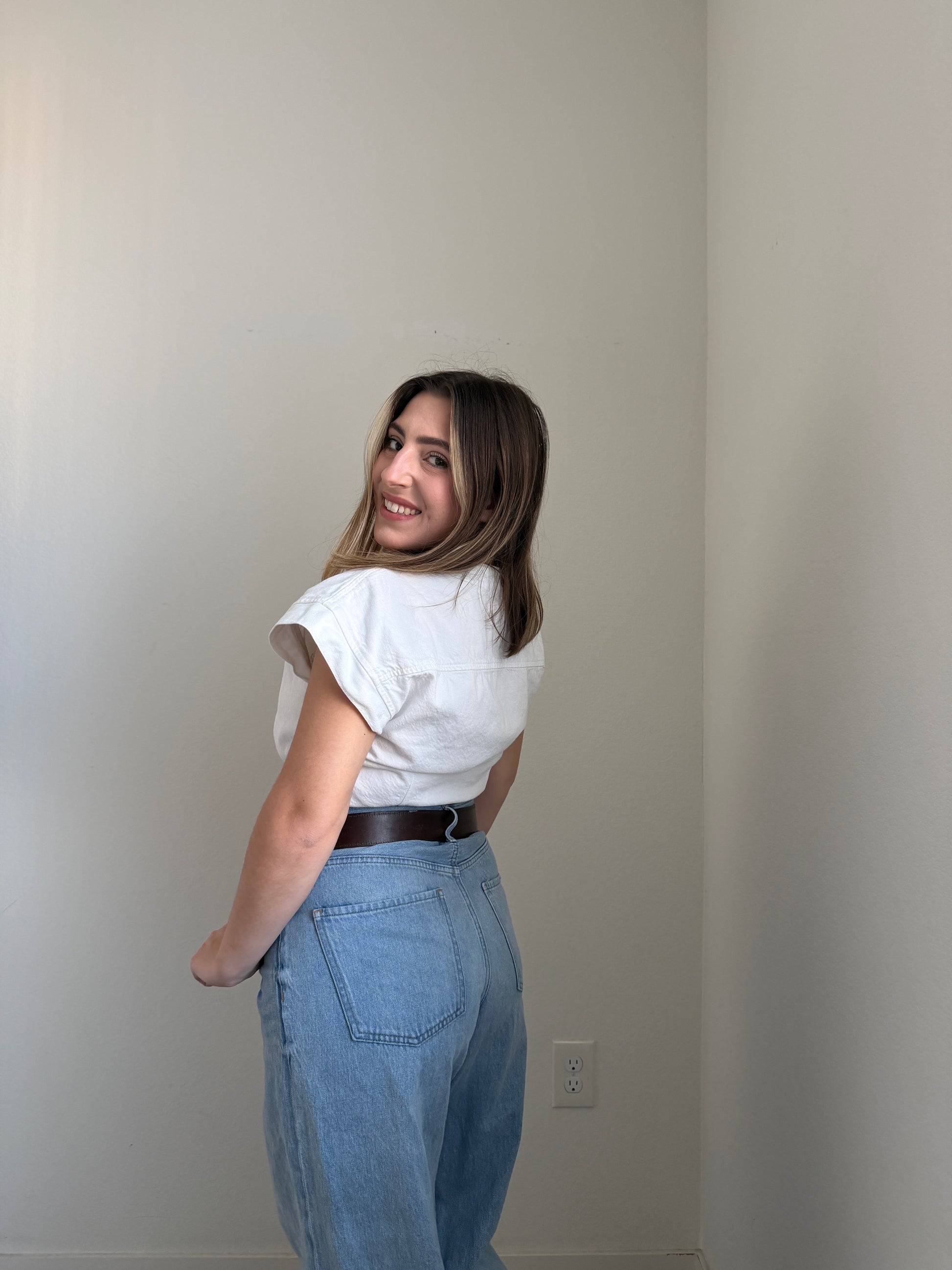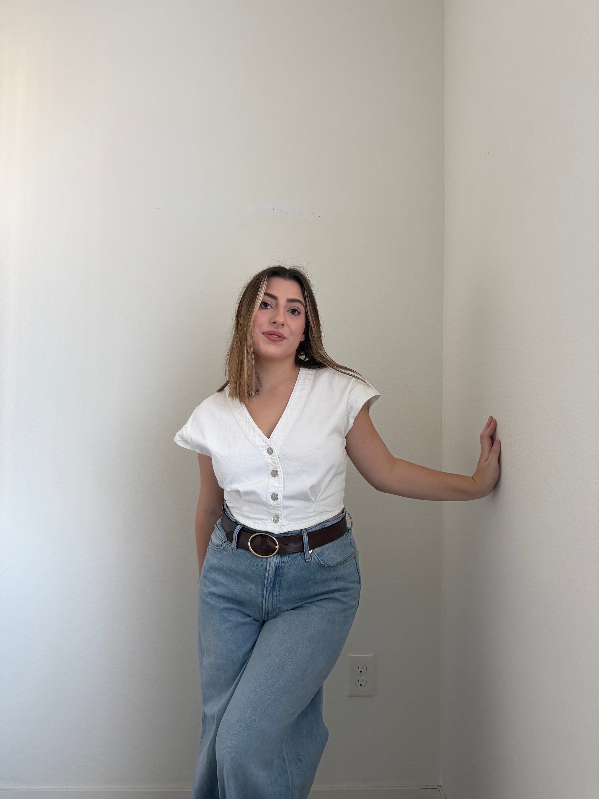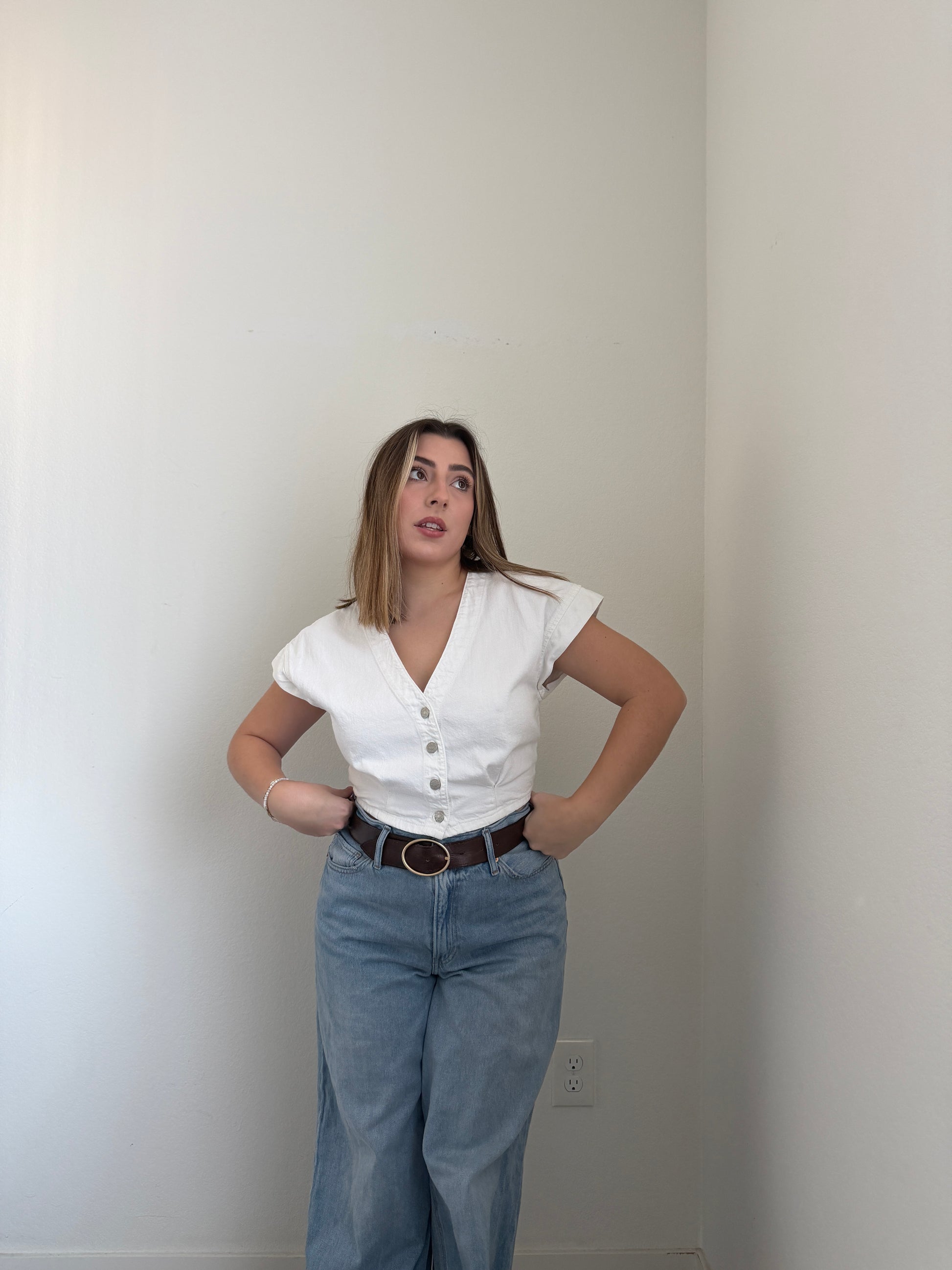 This lightweight cotton denim crop top has short cap sleeves and buttons down the front. The pleating gives it such a good silhouette, so flattering! Retailed $82
